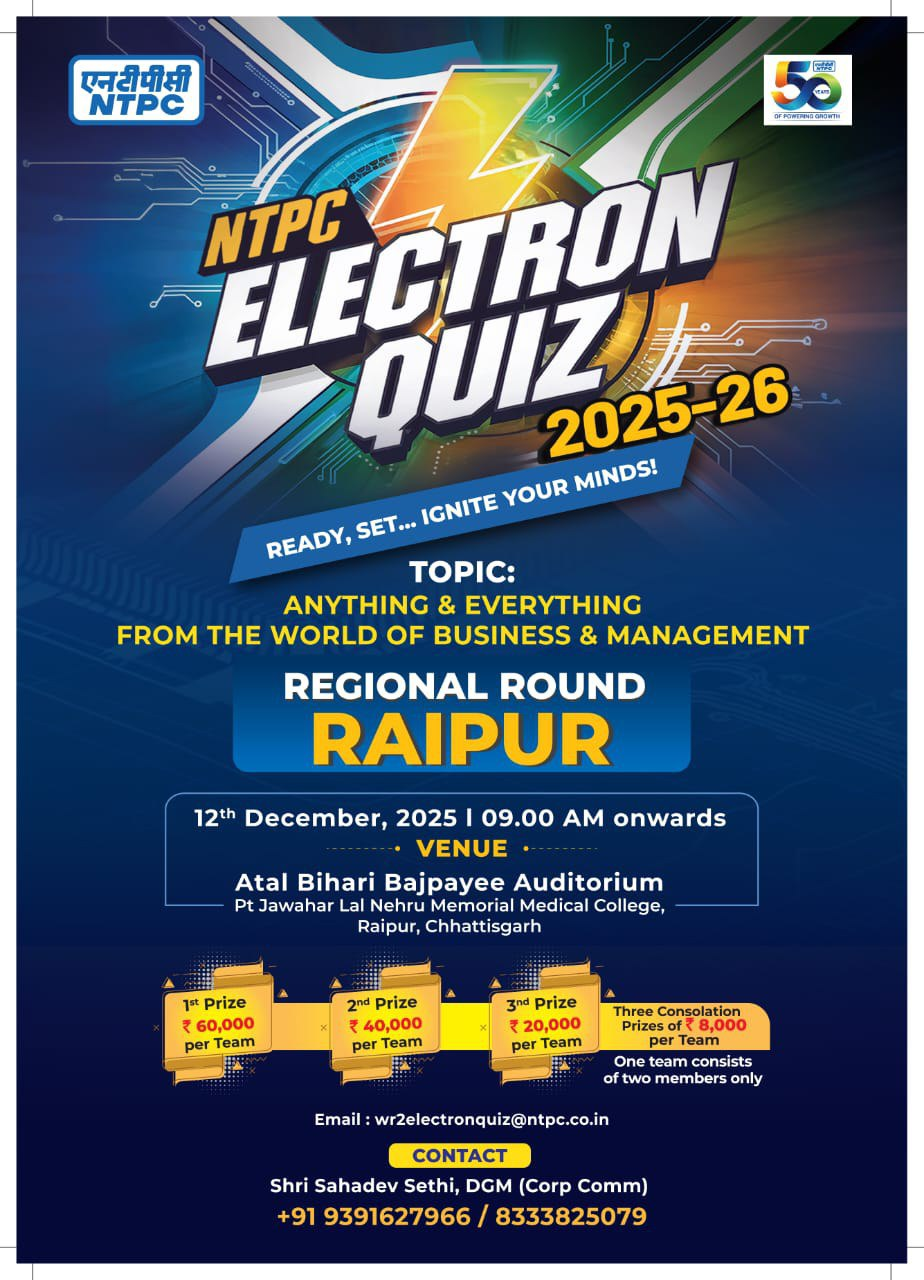 एनटीपीसी इलेक्ट्रॉन क्विज़ 2025-26: रायपुर में 12 दिसंबर को होगा आयोजन, मिलेगा 1 लाख रुपए इनाम